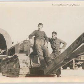 Part of collection of Civilian Conservation Corp photos. Black and white snapshot print. Image of two men in front of a caterpillar dozer with cleated tracks. the tongue of a large piece of equipment is in front of the dozer. One of the men stands on the end resting on the ground. Behind them is the back of a truck with a curved canvas cover. Behind to card right is another truck with dual wheels and dump bed.