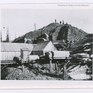 Update 2008: Two black and white reprints from Meyer's Photo Services of the Mountain of cordwood at Portland Mine. Part of the wooden mine building is in the foreground with residual snow banks to right of mine. Two women wearing hats, skirts and jackets are standing atop the cordwood. Two men are standing to the left of the women; both men are wearing hats. One appears to be dressed in work clothes and the other is dressed in a three piece suit. A large stack of planed lumbar is on the boardwalk in the foreground.