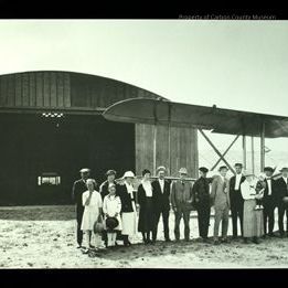 Black & white print - Written on back in pencil: "1. H Larson 2. Mrs. H Larson 3. Perhaps daughter of H Larson (in front of them) 4 Elsie Larson 5 Mrs. Homer France 6. Mrs. Fred Rendle (Fannie) 7. Herschel Dunlap 8. W. W. Weaver 9. Ross Alcorn 10. Dr. Barber 11. N. R Greenfield 12. Mrs. Greenfield. - Fred Kelly in her arm. 13. 14. Homer France 15. Fred Rendle 16. Percy Smith with mail pouch Postmaster 17. Pilot (Collison) 18. Louis Schalk- Deputy Postmaster with mail bag 19. 20. Ben Ashlock 21. Chris Larson 22. 23. Ive Eames"