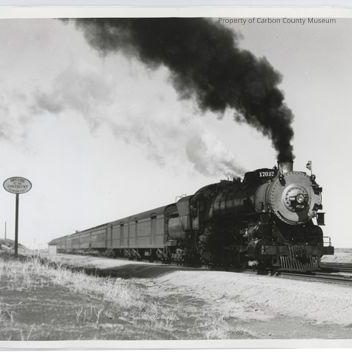 Update 5/2010: Black and white glossy print of a steam locomotive pulling cars. Engine is bellowing black smoke and a metal placard on top has: "X7032". Front is round with a light and 2 more placards with"X7032" on them. A sign on a pole on photo left reads: "Divide of the Continent. Elevation 7104 Ft."