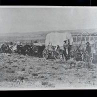 Black & white print on grey backing. Image of freight wagons & bull teams. Wagons are in a line & there appears to be seven wagons, one of which is covered with a light covered fabric gathered at the back. A man on horseback is behind covered wagon. Another man stands beside wagon on photo right. Another man stands away from wagons on photo left. Both men are holding a long stick or pole. Bulls are standing in front of or beside wagons & are not harnessed to wagons. In distance building can be seen. (Possibly Ft. Steele)