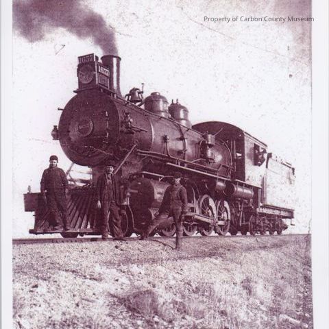 Black & white scanned copy of train locomotive. Train engine has number "1657" on top on square in front of smoke stack. Black smoke is floating from stack. Behind stack is a bell to which is attached a cord running to cab. Two round cylinders are on top of barrel shaped tank that is mounted above wheels. Pipes & rails are protruding from barrel shape & running along sides. One large tank is mounted on side in front of the wheels. Two smaller tanks are hanging by straps near cab. Locomotive has a cow catcher on front on which a man is standing. Two more men are standing beside train, one has his arm across engine front, the other has one foot leaning on rail. Another two men are in cab leaning out the window. The back of engine is box shaped with smaller wheels beneath. Grassy foreground in front of tracks.