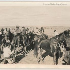 Black and white snapshot print. Image of a group of men and horses. About 6 men are mounted on horses, more men are standing or walking around the horses. Some horses are unsaddled with just ropes around their necks. A long pole fence is in the background and more men are walking. Part of collection of Civilian Conservation Corp photos. Condition good. Curled.Collection