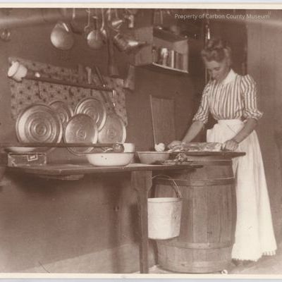 Update 5/2010: Black and white print on cream colored mat. Image of a lady using a rolling pin on a board on top of a large wooden barrel. Barrel is banded with metal strips. Beside barrel is a wall table held up with one leg. On wall behind hand various cooking utensils, a wood shelf with cans, and a rack holding pan lids. There is also a galvanized bucket sitting inside a lower sided pan and another bucket hanging under the table. The lady has light colored hair, pulled up from her face and neck into curls. She is wearing a vertical stripe blouse with white collar and a long white apron tied at her waist. Written on a piece of white paper taped to the back in blue ink: "Jean Burnett this picture was taken in 1900 in Little Medicine Country. In 1965 Mr. Burnett was 98 years old an living in the Valley Manor Rest Home in Casper. " In pencil: "page 96, pix 2 1/8 x 3-31 1/2 %".