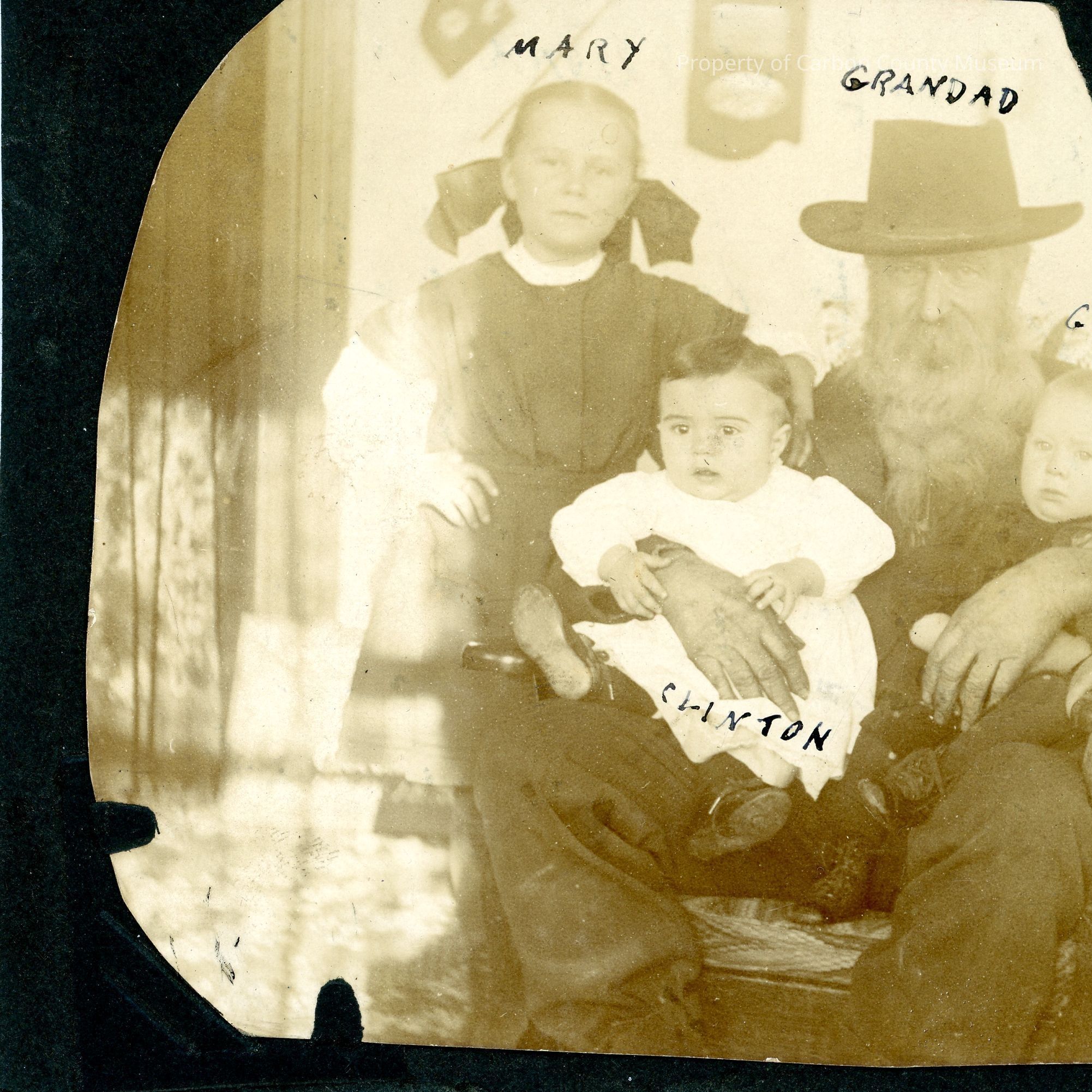 Sepia tone photograph pasted/glued to a black construction paper backing. Photograph is of an elderly man sitting down with two infants/toddlers on his lap, two young children stand beside the group. From left to right the following is written near/on the subjects - "Mary", "Clinton" , "Grandad", "Gilbert", "Me". Written on the back of the construction paper is the following: