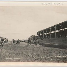Black and white snapshot print. Image of a rodeo grandstand that is covered, large posts and braces hold up the top. the front is solid boards that are flat and tall. Men on horses are in front of the grandstands. Across from them is a row of men on a pole fence. They wear western attire. Part of collection of Civilian Conservation Corp photos. Condition good. Curled.Collection