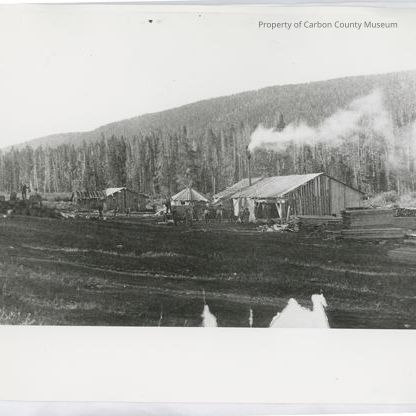 Update 5/2010: Black and white contact print of log slab buildings, piles of lumber and logs. Men are at various locations. Smoke is coming from a tall chimney on the largest building. The background is a timbered slope.