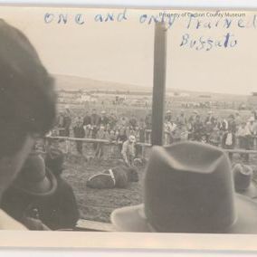 Black and white snapshot print. Image of a buffalo with harness on, laying down. Next to him is a man holding a small stick on top of the buffalo's head. Behind is a crowd of men inside and on a pole enclosure. In the distance is the opposite side of the rodeo grounds and dark rows of barracks type housing. in the foreground are hats and the back of people's heads. Written across the top in blue ink: "Pone and Only Trained Buffalo". Part of collection of Civilian Conservation Corp photos. Condition good. Curled, faded.Collection