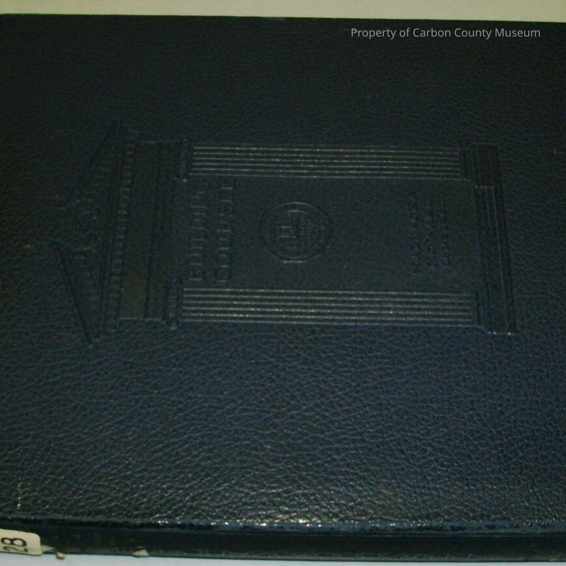 A very dark navy blue three ring binder used as a photograph album. Center front of cover has embossed "Building Counsel-Halleck & Howard Lumber Co." at center. the upper spine has a tiny white sticker with the #28 written in black ink. Inside the front cover is a 1 3/4" x 1 1/4'" sticker with "Dixie" written in ink on it, also printed are the words Jade& Minerals, both are crossed out. Below them is printed "Strattons I". the binder measures 11 1/2" x 9 1/2" x 1 1/2" thick. The donor used this book as a photo album of friends and neighbors ca. 1920-1950. First 13 pages of photographs concern Dixie and Orlando Peterson, their family pets and forest edge ranch home south of Tullis. They were Larsen's Ranch neighbors. Included also are Peterson's son-in-law, Vern Phillips, wife and family, their daughter Lyn, (Mrs. Robert F. Finsey), Encampment Artist. Marlis family and home; Bob and Pat Ivey. Clippings from the Daily Times about Tom Sun, his arrival, his ranch and his wife; Sweetwater Country around the Sun's Ranch; Devil's Gate, Sun Ranch Fireplace; Grant Family, Baltimore, MD; Martha L. Butter field and the Frank Genite Family; Little Snake River ranchers and friends, including: Dove Helwick, the McCaries (McCarys); the Wrens, Danfords, McCargers; Laramores, Jessmers, Yousts, and Bill and Jo Duncan, George Sheehan, Dutch Morgan.