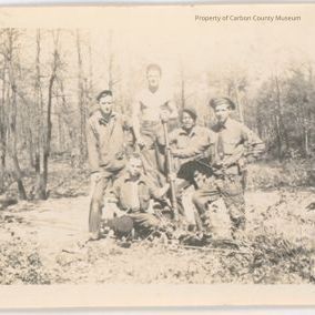 Black and white snapshot print. Image of five men in a wooded area of small bare trees. Four of the men stand. One on an object that makes him much taller than the others, he is shirtless. One man is kneeling and holds a pole with his left hand. Part of collection of Civilian Conservation Corp photos. Condition good. Faded, creased top right corner, scratched, curled, paper and glue residue on left edge.Collection