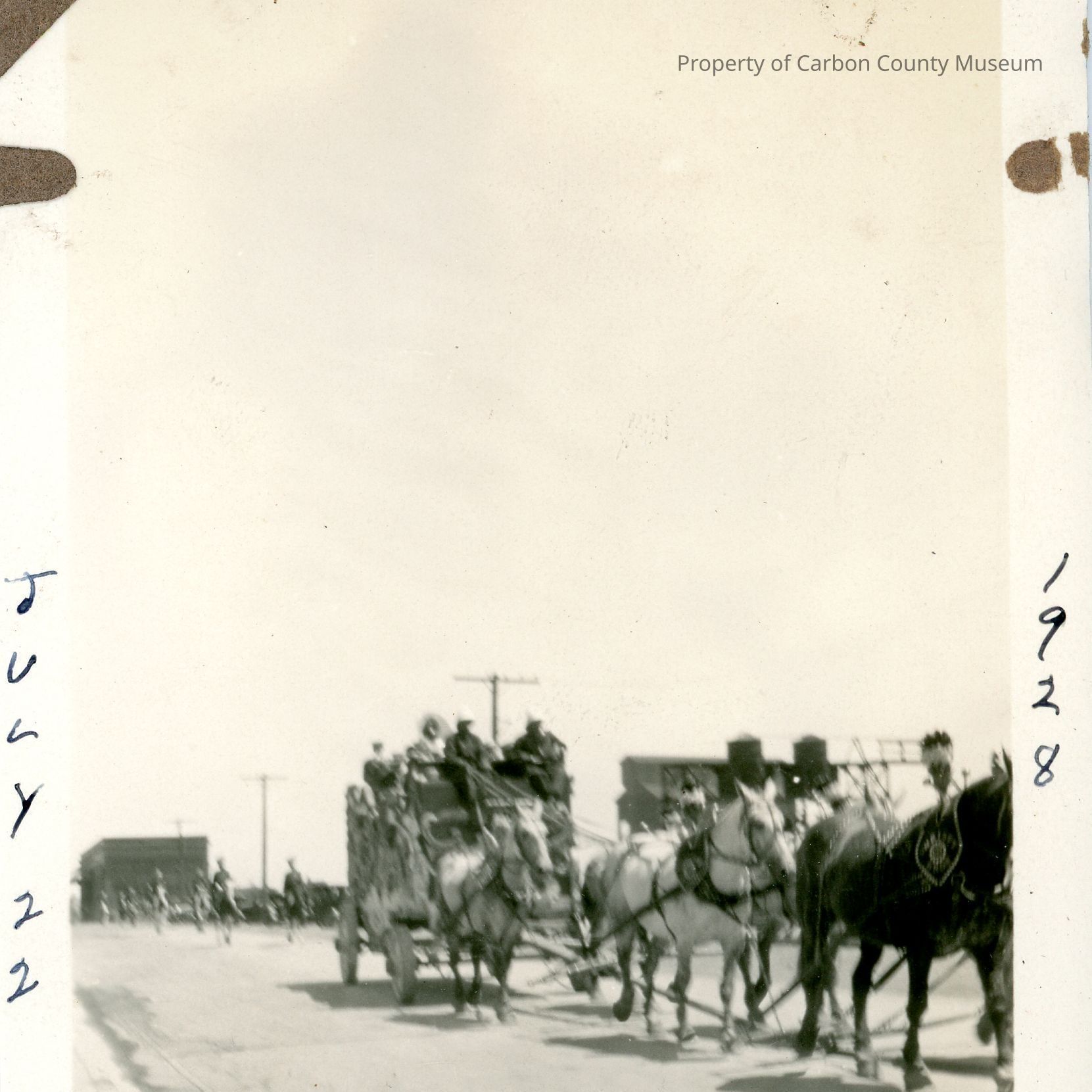 Black and white photograph. A team of horses are pulling a carriage down a paved street. Written along the top edge of the photograph is "RAWLINS", along the bottom "CHRISTY BROS. CIRCU PARADE", vertically along the left edge "JULY 22", vertically along the right edge "1928". Printed on the reverse is the number 22.Collection