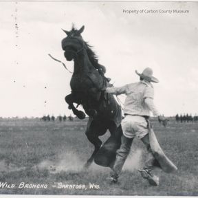 Black and white card. Image of a bucking horse. His front feet are in the air and dust is beneath him. There is a blindfold around his eyes. A cowboy is on the ground facing the horse. He wears a hat, chaps, spurs and his left arm is out toward the horse. Another cowboy is on the ground on card left. A horse stands behind him and is only partially seen. Written in white on original negative across card bottom: "Saddling a wild Bronc-Saratoga, Wyo." "Sanborn A. 766".