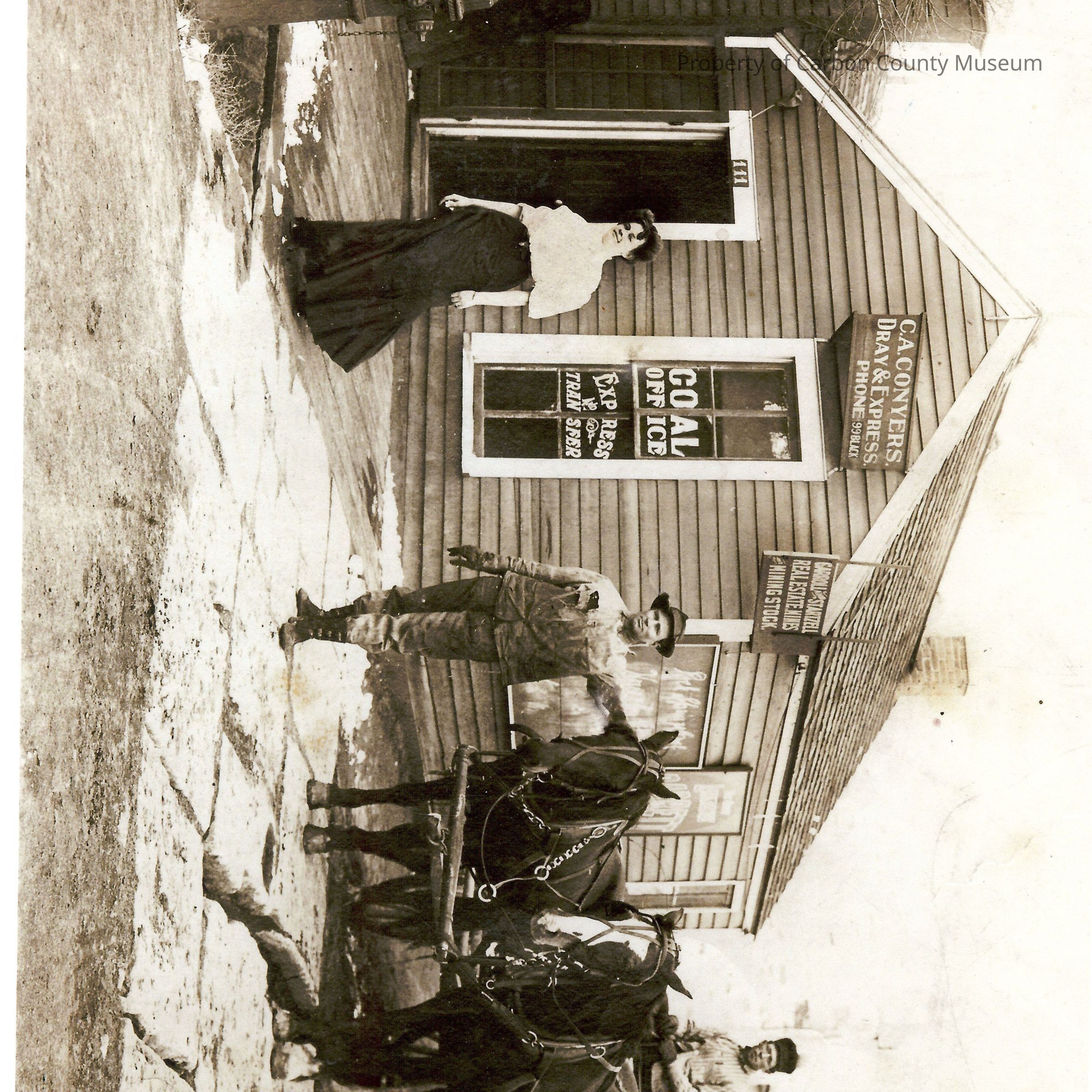 A black and white scanned photograph of the office of the Conyers Transfer & Coal Company, 1904, Rawlins, WY. From left to right: Mrs. H. J. McGee; Clarence A. Conyers, and Edwin Buchanan, son of Mr. and Mrs. J. E. Buchanan. On side left of print is a wooden frame building which has a sign on the window which reads Friend Journal and Job Printing. A smaller sign to the left of the window reads Office Rawlins Townsite Co. Lots for sale. There is a small wooden frame building, on side right of the Friend building that has a sign in the window which reads Coal Office Express Transfer. Multidimensional sign above this window reads: C.A. Conyers, Dray and Express. Phone 99 black. Number over the doorway entrance: 111. Woman is dressed in long black skirt, white puffed sleeved blouse, her dark hair is in an updo. On photo side right is a freight wagon hitched to a two horse team. A man wearing work clothes and a dark hat is sitting in the driver's seat holding the reins. A man dressed in soiled workclothes is standing to the side of the team with his left arm resting on the outside horse's head. He is wearing dark gloves, hat, and galoshes. A rough square blocked side walk is in foreground of the horses, and a wooden planked sidewalk is in front of the two buildings. There is a tall fire hydrant at edge of sidewalk at side left of print. Measures 8 1/2" x 11."