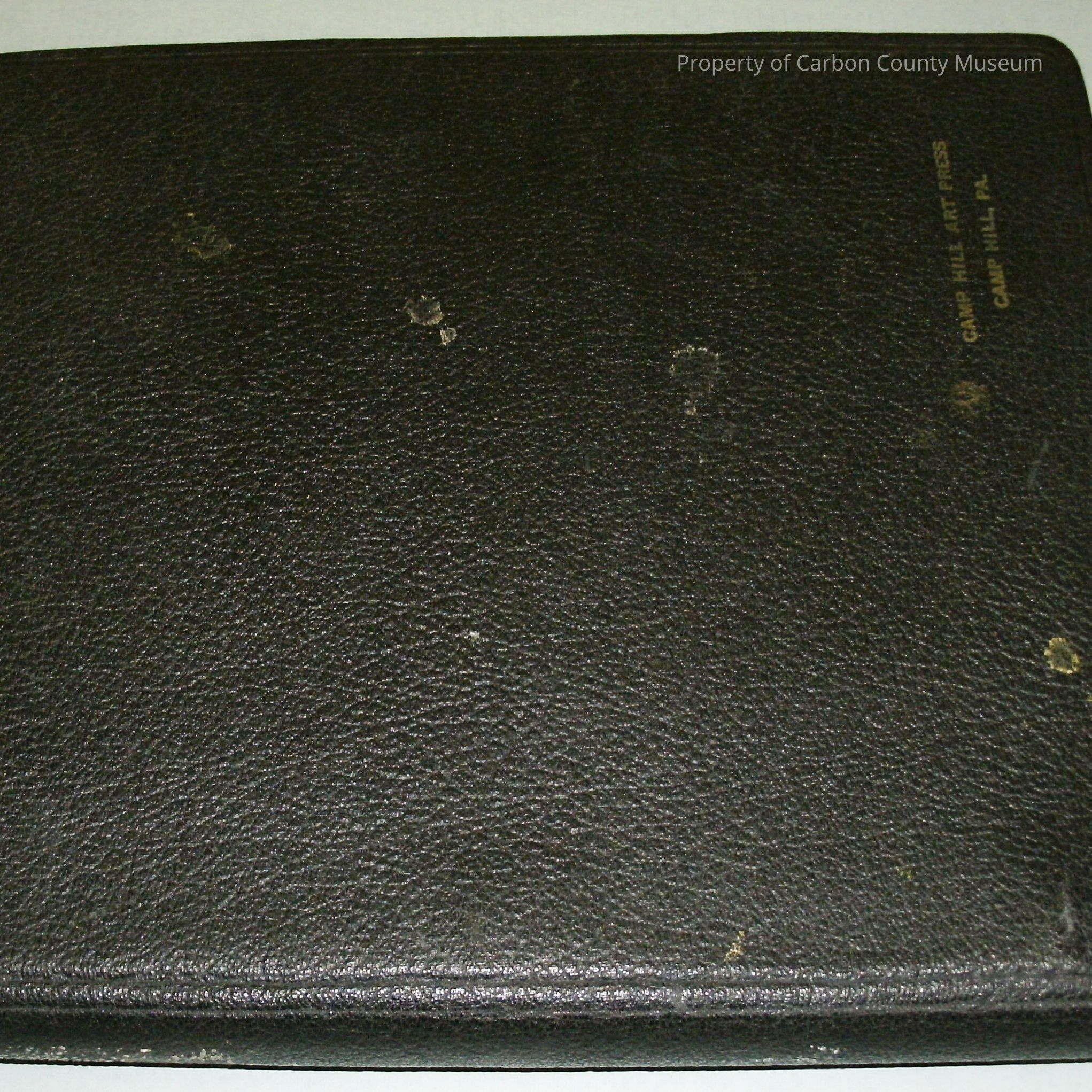 A black three ring binder used as a photograph album. At top of spine is printed the number 1 in white paint?, beneath this is number 4 over number 6, also in white. The lower right hand corner of the front cover is embossed "Camp Hill Art Press, Camp Hill, PA". There are no markings inside the front cover. Binder measures 11 1/2" x 10".