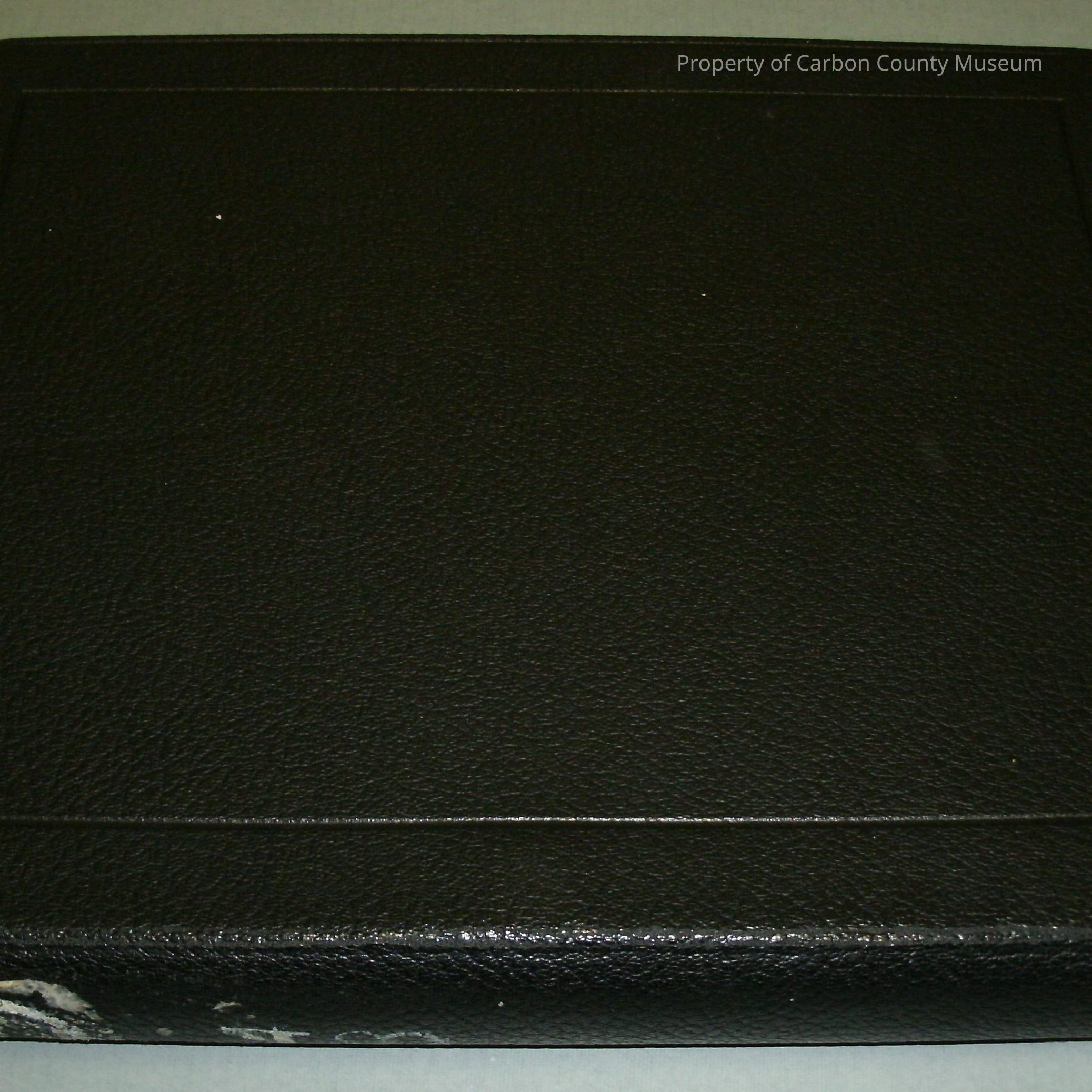 A black three ring binder used as a photograph and scrapbook. Spine has a large number 5 printed in white at the upper spine. One inch below it there is a smaller number 4 over a number 8, both in white. Cover has an embossed rectangular line on front cover. Inside front cover has a torn white sticker with 1948 crossed out and 1949 under it, "Hard winter snow C" written in black ink. Book measures 11 1/2" x 10". Book contains photos of the winters of 1940, 1945, 1946, 1947, 1948, 1949 and Seminoe Camp, 1931 before the dam was built.