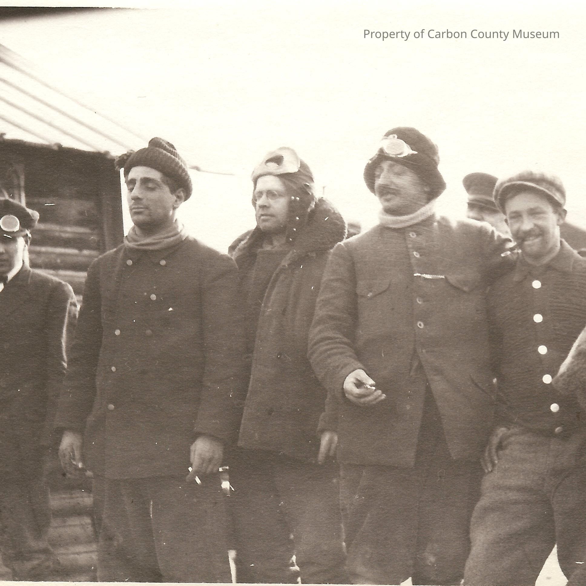 Black and white print of 9 men dressed in heavy clothing, hats and coats. They are standing outside, several of them are holding cigarettes. A couple of them have driving goggles above brim of their hat. Six man are in front row, one with his arm around shoulder of another. Three others stand behind and may be observers. They are standing next to a log structure with words painted on side. (Not enough visible to read). Written on back in pencil: "1908 NY to Paris Auto Race. Italian Drivers." Condition good. Back soiled.Collection