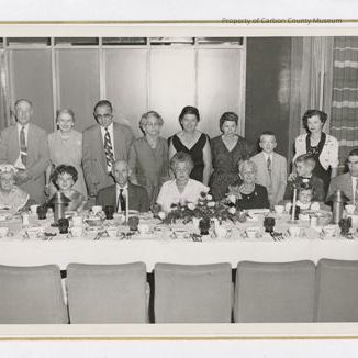 Black and white print on gold edge mat of table set for dining. Two rows of well dressed people are behind the table. one row is seated with 4 elderly people, 2 children and 1 man. Back row has 4 elderly people, 3 women and a young boy. Table has floral arrangement of roses and ferns. Written on back in pencil: "Frances and Revelle McMicken".