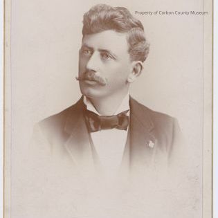 Black and white cabinet card studio print of John Osborne. A man with dark full head of hair, dark mustache, prominent nose. He is wearing a dark suit coat and vest, bow tie and white shirt. He has on a lapel pin. Printed in gold at bottom "Kirkland Cheyenne, Wyo".