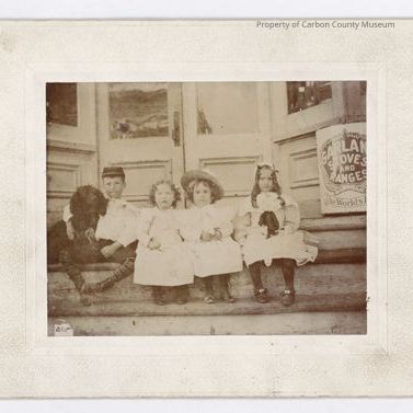 1. Image of 4 children sitting on steps of a store. On left is a black dog sitting next to a boy, the boy's arm is around the dogs neck. Boy has on a soldiers cap, white shirt, dark short pants, and leggings. Printed on caps: Dewey". Seated on his left are 3 little girls dressed in light colored dresses. The one in the middle has on a hat and the one on right has long ringlets of hair and bows and scarf on back of her head. Double doors into the store are behind them. A sign reads: "Garland Stoves and Ranges The Worlds B....".