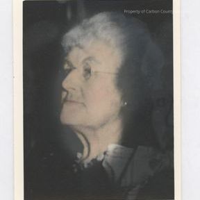 Color print of left profile of elderly woman. She has grey hair, wears glasses, dark dress and necklace. A shadow of another face is seen on photo right.