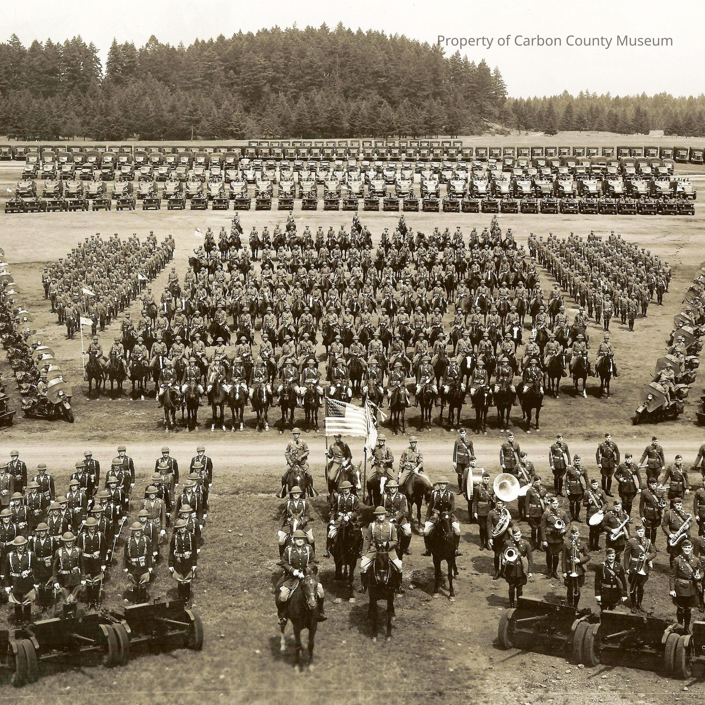Black and white glossy print. Image of large company of soldiers in formation. In the back rows are trucks, armored cars and jeeps. On both sides are mototcycles and jeeps. Beside them are standing soldiers. In the center are mounted soldiers. The horses are standing in eight rows. In the foreground on photo left are standing soldiers with 3 cannons in front of them. In the center foreground are 10 mounted soldiers, two of them hold flags. Printed in white on the original negative, bottom right, 2022-2. Written on back in black ink: Wyoming's Own 115th Cav. (H-Mecz) June 1942, NW IX Service command of 4th Army. The 115th before it lost its horses and became fully mechanized. H.S. Cashman
