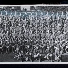Black and white glossy print. Image of 6 rows of men in uniform. They have on envelope style caps. The first row of 5 is kneeling on the ground. The next row is seated on the ground. The next rows are on 4 tiers of risers. A flag held by man on photo left reads "USD"