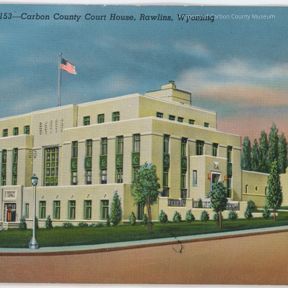 Two color postcards. Postcard a. and b. image of light colored stone building in three levels with flat roofs. An annex of 1 level is on card right. The building has tall windows with decorative trim. An American flag flies from a pole on the roof. The perimeter is landscaped with grass and trees. A sidewalk is at the edge next to the street. Blue sky and wispy clouds are in the background. Written on back in blue "Postcard"; Smaller letters "this is one of Wyoming's most beautiful buildings, occupying an entire square near the center of the city" Place for stamp, top rt. Written on front of card. Carbon County Court House, Rawlins, WY.Collection