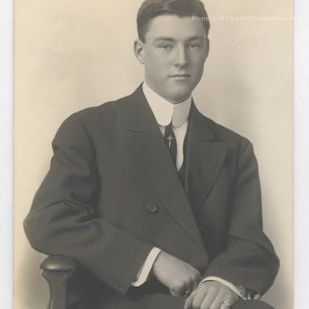 Black and white studio portrait of handsome young man. He is wearing a three piece dark suit, white shirt with stiff stand up collar, dark tie with cross shaped tie tack, and cufflinks. he is seated in a one armed chair with his right arm on chair arm.