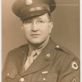 "US" on it and 2 patches on the shoulder. World War II. The man wears wire rimmed glasses. Written on the back in pencil: