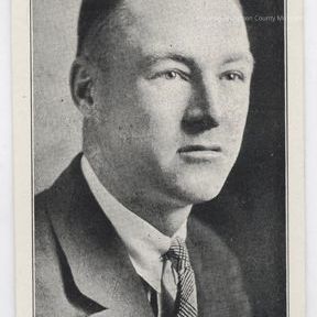 Black and white studio portrait of man. He is wearing a suit jacket, white shirt, and print tie and facing his left.