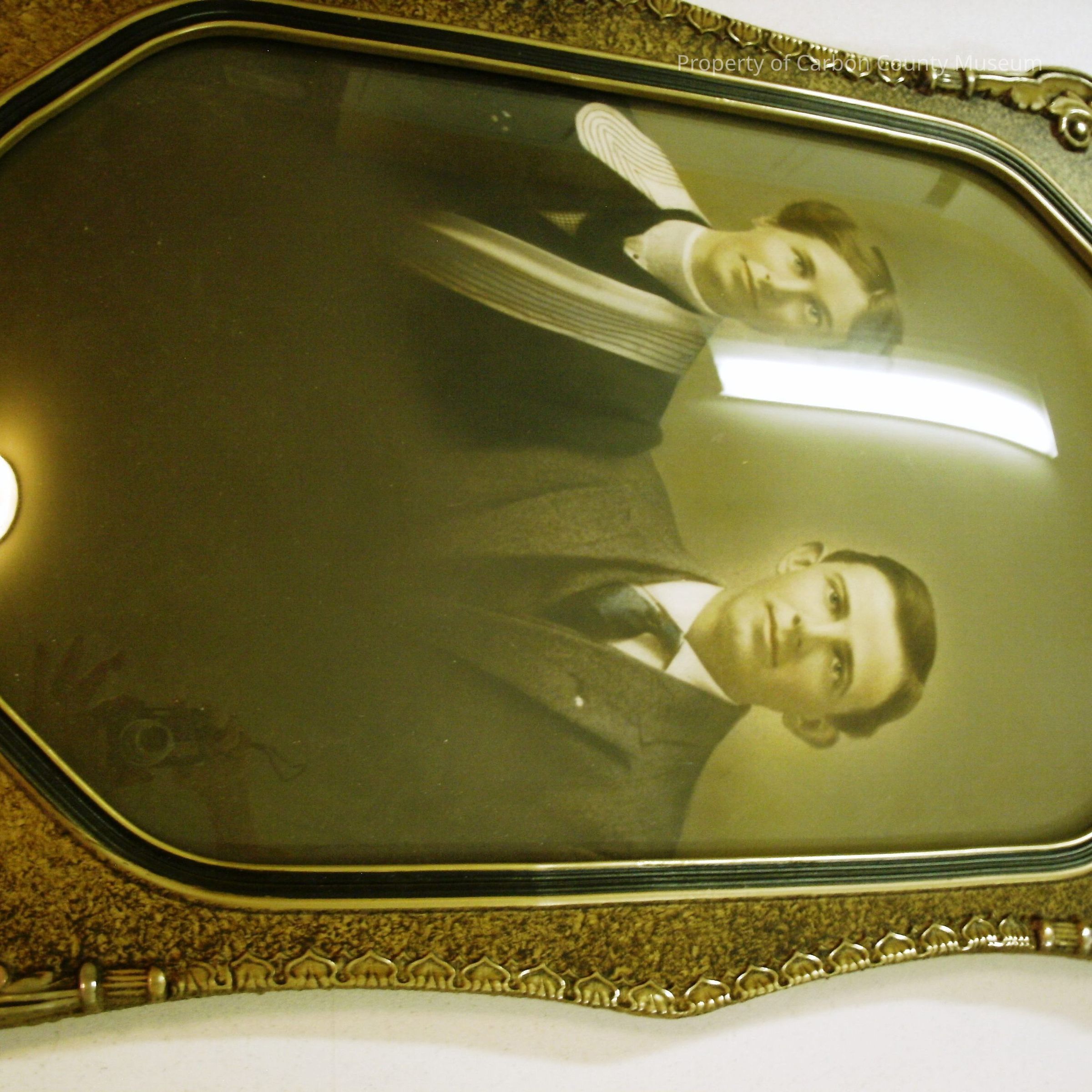 A 12" x 9" gold ornate framed, colored portrait of Edward (Eddie) Ordway and his wife Grace Flint Ordway ca. 1920. Frame has curved glass cover to photograph. Grace is wearing a black jumper? with a flat white scarf? wrapped around shoulder and draped to front right. Her dark hair is parted in the middle and put in an updo. Edward is wearing a three piece suit and tie.Collection