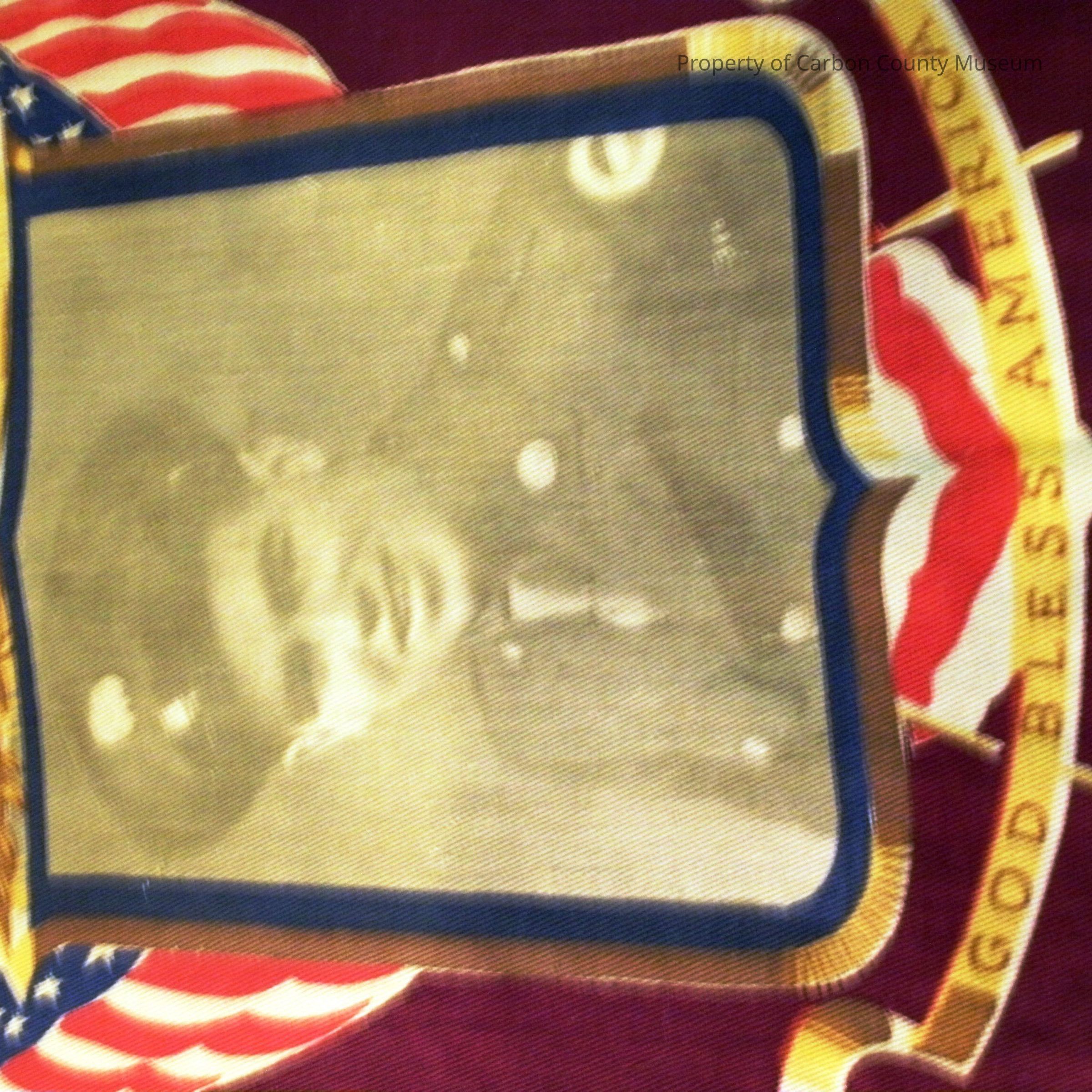 A black and white photograph imprinted on a decorative maroon banner, edged in gold; the photo is superimposed on a decorative United States flag with an American eagle on top, a liberty bell banner is at top. God Bless America stitched banner at lower edge across maroon fabric. At top is a gold braid hanger with a wooden dowel inserted at top. Photo is of Rollin Arnold.
