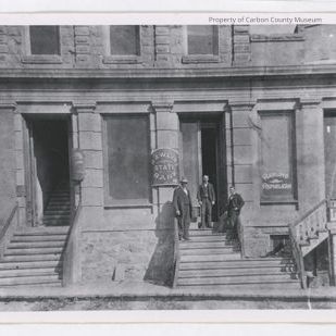 Written on back in pencil: "1899 Murphy Ready Building located on the corner of 5th & Front Sts. Those in picture are William Daley, Homer France & J. A. Rendle. Photograph after January 1896 to 1900. Bank organized Jan. 1, 1899. Note: Rawlins State Bank on parts of lot 14 & 15 Block 23. Republican office moved to basement in early 1900. Building on right on parts of lot 15 & 16 Block 23 built in June 1900 as Wyoming Saloon & Club rooms. Fred Duelon had building in 1902 & Fred Rumph & David Nicholas Saloon in Oct. 1907".
