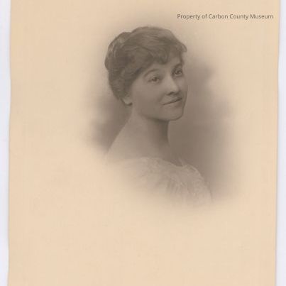 Black and white studio portrait of woman. View of head and shoulders .She is facing to photo right, her hair is pulled back, softly and loose in front, to a bun on the back of her head. She is wearing a light colored, low round neck, embroidered dress. Grey photo coloring surrounds her neck and face. Embossed in lower right corner: "Champlain Studios Boston New York" in a curvilinear flourish.