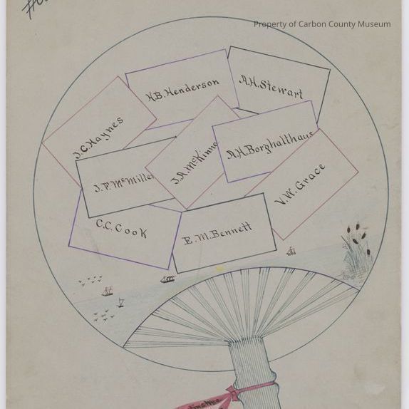 Written on red ribbon on handle: "Rawlins, Wyo. April 1888". In bottom left corner in black: "Comps of E. M. B."