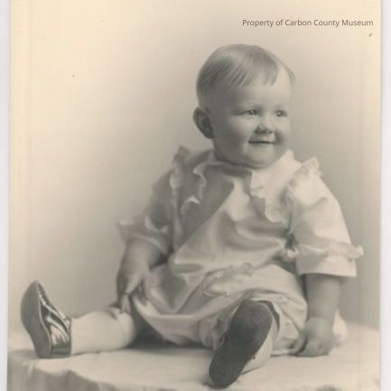 Black and White Studio Portrait. Image of and infant sitting on a white cloth on a round object. The child is dressed in a light colored jump suit with banded cuffs at elbows and knees. There are ruffles around the front and sleeves. The childs shoes are black. The child has medium colored short hair. Written in back in pencil: 68