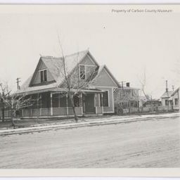 Black and white print of many peaked house with covered porch on two sides that have decorative colored posts and railing. Top edges of roof have a trim that is cut in a repeating pattern extending up. house is two story with gabled window on front and window on eave on side. Other residential buildings can be seen in the background. Trees with no leaves are along sidewalk and street is dirt.