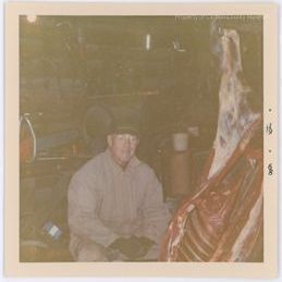 Color print of man sitting beside a dressed out animal carcass. Background appears to be the inside of a garage.