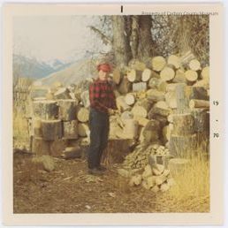 Color print of a man standing beside cut wood. He is wearing a red and black plaid shirt and jeans and red hat with ear flaps folded up. he is holding a smaller piece of wood. Most pieces are from large trees but a smaller pile of kindling is near his feet. Trees and mountains are seen in background.