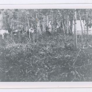 Update 5/2010: A black and white snapshot. Image shows a group of men and women dressed in vintage clothing standing in a wooded area with tents at various locations. A white horse and wagon? is seen at side left in trees. Foliage is seen in foreground.