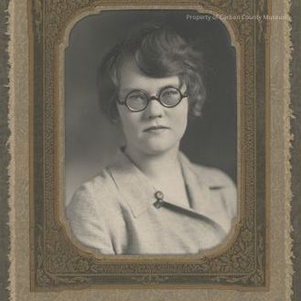 Update March 2011: 2nd original. Black & white studio portrait. Photo of a young lady wearing black round rim glasses. Her hair is combed to a big wave on the left side of her forehead - Hair is cut short & sides are combed back. Dress has "V" shaped neck opening & has a pen or button on right lapel. Clothes are light colored. Her hair is dark in color.