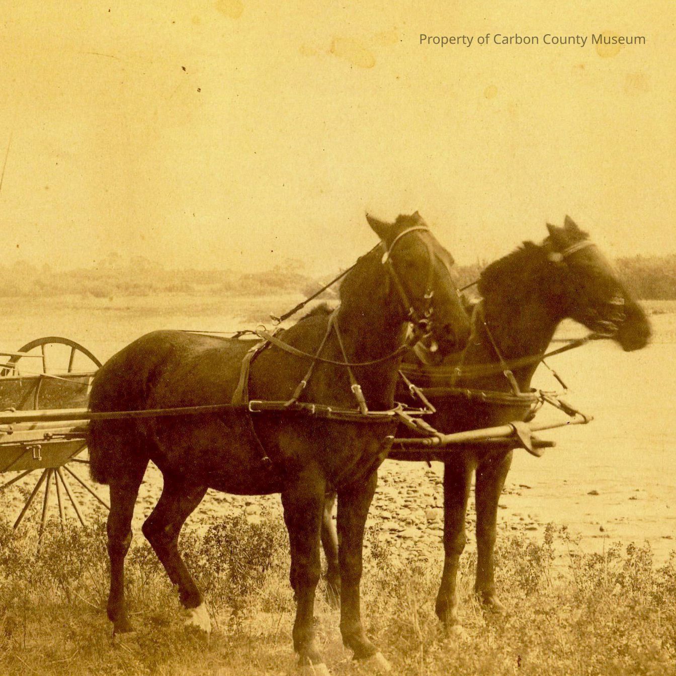 A sepia toned photo printed off of a cd sent by the donor of her great-grandmother driving a buckboard pulled by a two horse team. She has stopped by the river, a black and white dog is in the foreground left. She is wearing a patterned hat with brim and long dress. Whip is placed in vertical holder at wagon front right.Collection