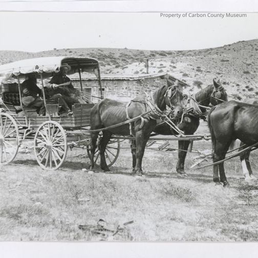 Update 2008: Black and white glossy reprint of 4 dark horse team canvas covered buckboard type wagon with a man driver in front seat. A person is sitting in rear seat and unable to distinguish sex or clothing. The canvas roof has both sides rolled up and secured at roof top creating open sides. The rear two horses are wearing blinders. There is a rock and mortar building in the background that resembles a stage station. Vegetation in foreground and background is sparse and desert like. A rope and strap? are lying on the ground center foreground.