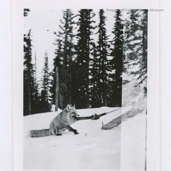 Update 2008: Black and white glossy reprint of a medium colored fox with dark legs. His left foreleg is caught in a trap which was set in an open area of a snowy forest.