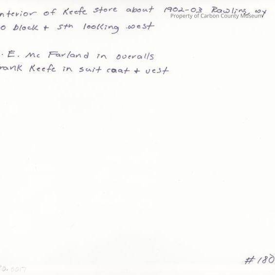 Copy 1. Written on back: " interior of Keef (sic) Store about 1902-03 Rawlins, Wy. 100 Block and 5th looking West. HE. McFarland in overalls. Frank Keefe in suit coat and vest." Condition good. Size 8 x 10.