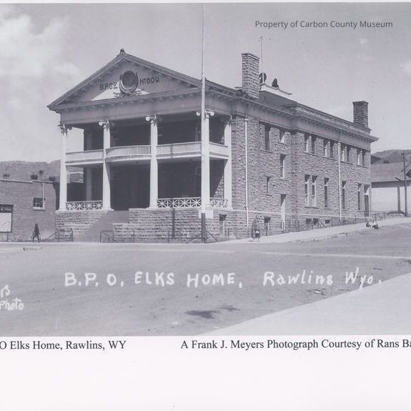 Written on front in white on original negative: "Meyers Photo BPOE Home, Rawlins, Wyo." Printed on bottom in black: "BPOE Elks Home, Rawlins, WY A. Frank J. Meyers Photograph Courtesy of Rans Baker".