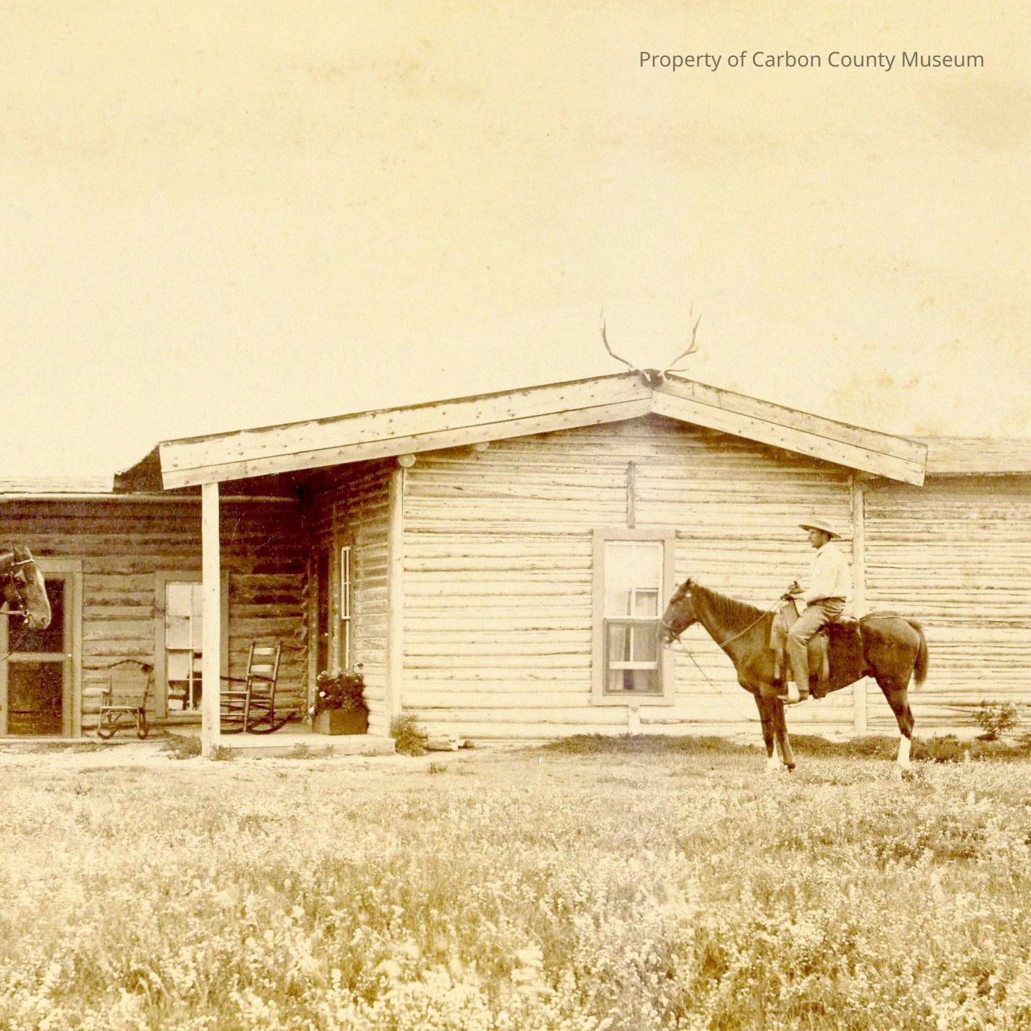 A black and white print 4" x 7," image shows a large log house with 4 distinct sections. Elk horns are mounted on apex of center roof edge. Side left of print shows two women wearing white dresses are in a single horse pulled buggy. A dog is lying on ground to side of buggy. A man is sitting in the saddle on a dark horse at side right, facing the women. Grass is seen in foreground. A tall pole is attached to house at side left. Donor states: The Willows Spring Creek, August 1885, Edward Lyons Swazey home in Wyoming.Collection