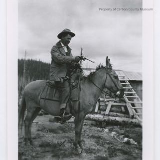 Update 2008: Black and white glossy reprint of a man on horseback wearing pants with rolled up cuffs and jacket, light colored shirt and hat holding a long barreled pistol in his right gloved hand aimed at the horses head . The man is holding the reins in his left hand and resting it on the saddle horn. The horse's ears are standing straight up and is wearing a muzzle type headstall. A wooden structure is in right side background with a wooden ladder leaning on the roof. Aspen logs are lying at structure bottom edge. A treeline rises to the horizon at photo's left view.