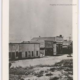 Black and white postcard. Image of dirt street in front of clapboard buildings. Buildings are identified as the South Side Saloon, The Alamo, and the Cozy Saloon. South Front Street is in front of buildings and brush on opposite side. In bottom right corner on original negative in white: "119". Written on top in white on original negative: "Rawling (sic Rawlins) Front St. South of railroad tracks." Printed on back: "Postcard" "Address" "Place Stamp Here". Bordered by a square.