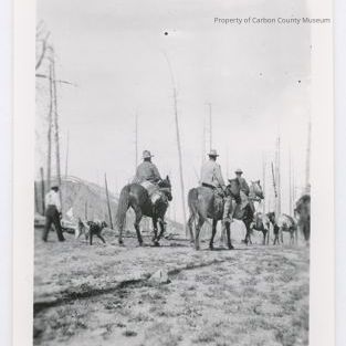 Update 2008: Black and white glossy reprint of three men on horseback and one man walking at the left side of the riders. A dog is between the rider and the walker. The men and horses backs are to the camera. Two of the men have large rolled blankets behind their saddles. The lead rider has a rifle butt protruding to his right and in front of him are two pack horses with game/equipment slung over the back. There is part of the rear of another horse at photo right edge. The foreground is dirt and sparse vegetation. Tall trees to the left are devoid of any leaves. A hill is seen in the left background.